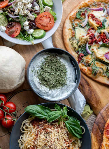 Tender chicken breast fillet marinated in tandoori sauce, pine nuts, roast capsicum and shaved parmesan with fresh basil and served with homemade tzatziki on a tandoori base.